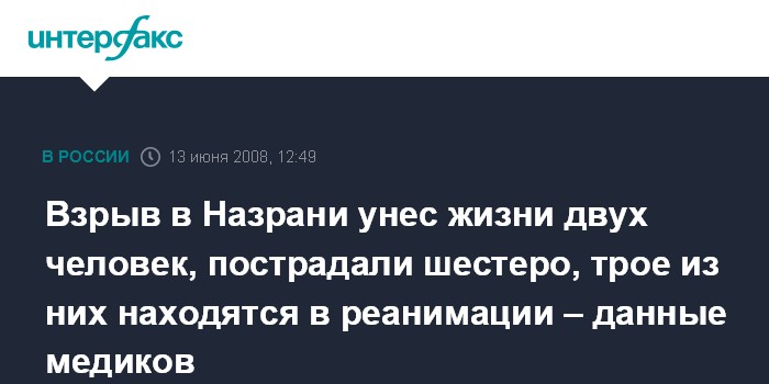 Назрань. 13 июня. ИНТЕРФАКС-ЮГ - Шесть человек пострадали в результате взрыва в магазинах в Назрани (Ингушетия), все они были доставлены в приемное отделение, сообщили агентству "Интерфакс-Юг" в республиканской клинической больнице в пятницу.