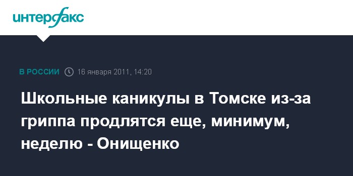 Москва/Томск. 16 января. INTERFAX.RU - Школы в Томске еще неделю будут закрыты на карантин из-за превышения в городе эпидемического порога заболеваемости гриппом, заявил руководитель Роспотребнадзора, главный государственный врач РФ Геннадий Онищенко. "Пока школы в Томске закрыты на карантин еще на неделю", - сказал Г.Онищенко "Интерфаксу" в воскресенье. Томск - город в Западной Сибири с населением более 500 тыс. человек.