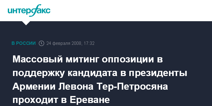 Ереван. 24 февраля. INTERFAX.RU - На площади Свободы в воскресенье в Ереване продолжается массовый митинг сторонников кандидата в президенты Армении Левона Тер-Петросяна, который сегодня собрал, по разным оценкам, от 20 тыс. до 25 тыс. человек.