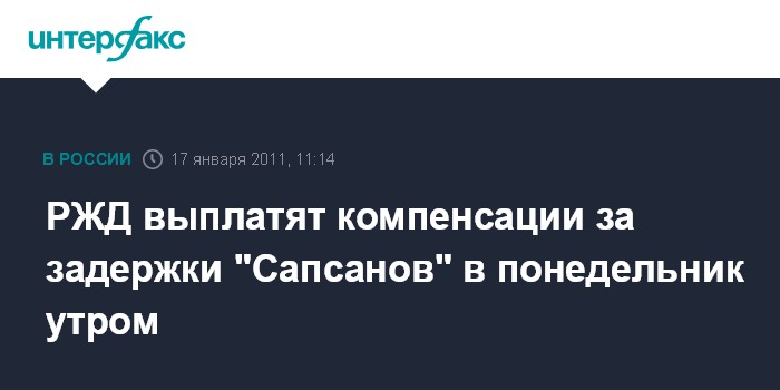 Москва. 17 января. INTERFAX.RU - ОАО "Российские железные дороги" (РЖД) выплатит компенсации пассажирам высокоскоростного поезда "Сапсан", отправление которого из Санкт-Петербурга в Москву было задержано в понедельник утром более чем на 2 часа, сообщили РЖД.