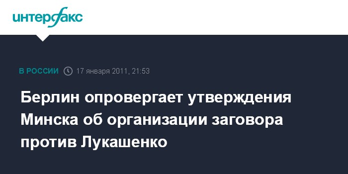 Берлин. 17 января. INTERFAX.RU - Германия называет "абсурдными" обвинения со стороны Белоруссии в том, что Берлин совместно с Варшавой выступили с заговором с целью свержения президента страны Александра Лукашенко, организовав массовые манифестации против его переизбрания.