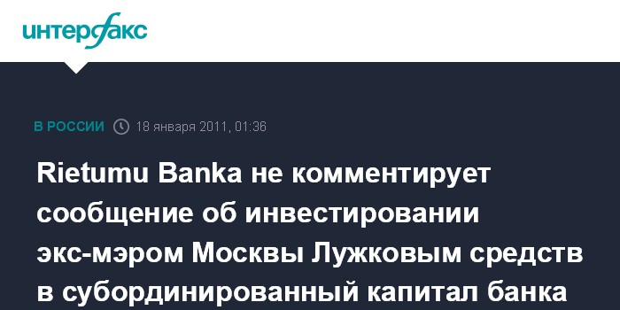 Москва. 18 января. ИНТЕРФАКС - Латвийский "Rietumu Banka" не комментирует распространенное в понедельник сообщение об инвестировании бывшим мэром Москвы Юрием Лужковым средств в субординированный капитал банка.