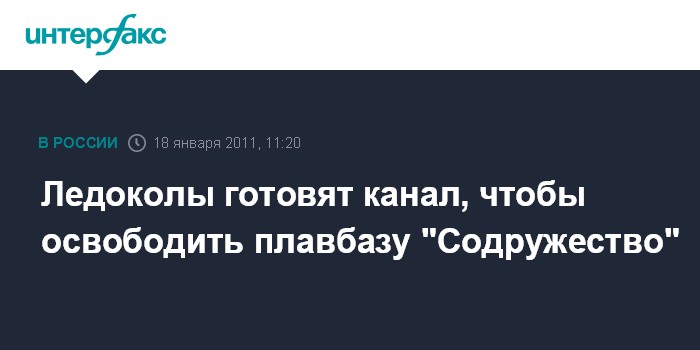 Москва. 18 января. INTERFAX.RU - Ледоколы "Адмирал Макаров" и "Красин" во вторник проводят подготовку канала для дальнейшей проводки плавбазы "Содружество", сообщила пресс-служба Минтранса РФ.