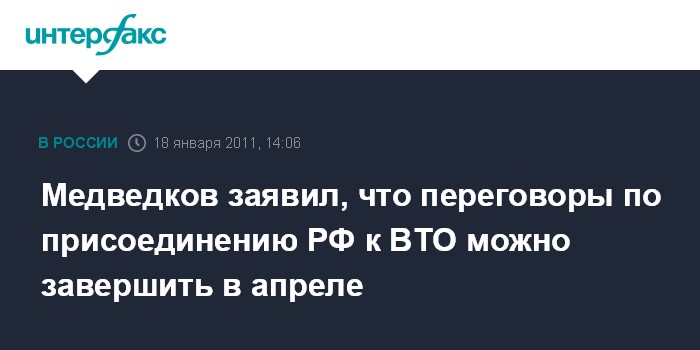 Москва. 18 января. INTERFAX.RU - Переговоры по присоединению РФ к ВТО технически возможно завершить в апреле 2011 года, заявил глава российской делегации на переговорах по присоединению к ВТО Максим Медведков на пресс-конференция во вторник в Москве.