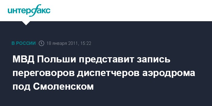 Варшава. 18 января. INTERFAX.RU - Министерство внутренних дел Польши во вторник представит запись переговоров диспетчеров аэродрома под Смоленском, дежуривших в момент крушения самолета президента Польши Леха Качиньского, передает польское радио.