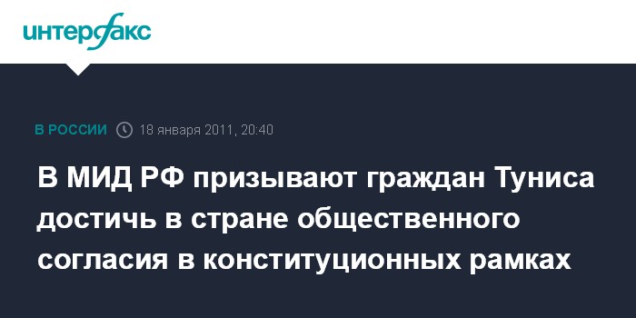 "Исходим из того, что в интересах всех тунисцев всемерно способствовать скорейшей нормализации обстановки в стране, обеспечению безопасности и стабильности. Неотложную задачу видим в достижении общественного согласия в конституционных рамках на путях демократического диалога и проведения назревших преобразований", - говорится в сообщении МИД РФ, размещенном во вторник на сайте ведомства.