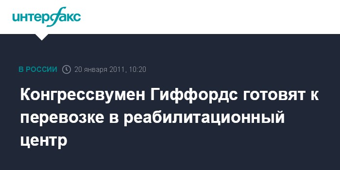 Лондон. 20 января. INTERFAX.RU - Раненная в голову член Конгресса США Габриэль Гиффордс в пятницу будет перевезена из больницы университета штата Аризона в реабилитационный центр "Мемориал Херманн" в Хьюстоне, сообщила в четверг BBC со ссылкой на родственников политика.