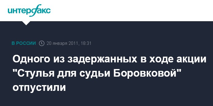 Москва. 20 января. INTERFAX.RU - Одного из двоих задержанных у здания Тверского мирового суда в ходе акции "Стулья для судьи Боровковой" отпустили из ОВД "Китай-город" после составления протокола.