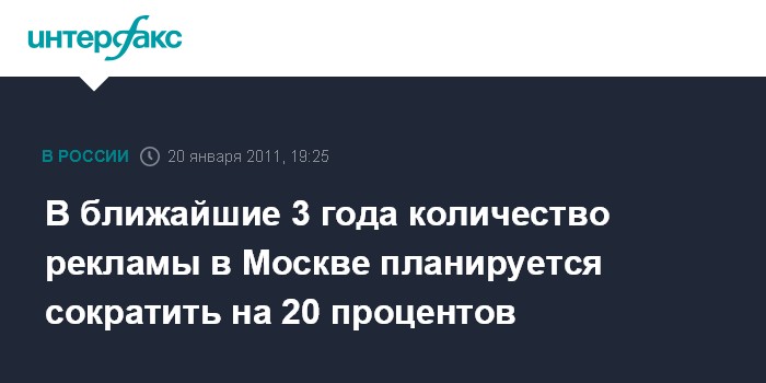 Вместе с тем согласно проекту постановления правительства Москвы о разработке и реализации концепции размещения рекламы на 2011-2013 годы в столице за три года планируется сократить число объектов наружной рекламы не менее чем на 20%.