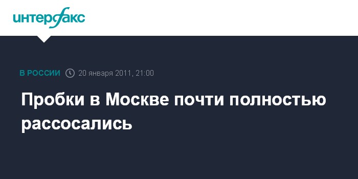 Москва. 20 января. INTERFAX.RU – Пробки на дорогах столицы почти исчезли. По состоянию на 21:00 мск индикатор аналитического центра "Яндекс.Пробки" оценивал ситуацию на дорогах столицы как 4 балла ("местами затруднения ") по десятибалльной шкале. Напомним, что в первой половине дня индикатор несколько часов подряд впервые в этом году фиксировал пробки 8 баллов.