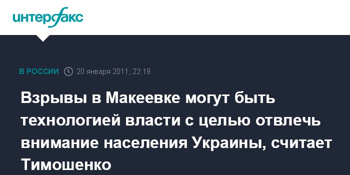 Киев. 20 января. ИНТЕРФАКС-УКРАИНА - Лидер Всеукраинского объединения "Батькивщина", экс-премьер Украины Юлия Тимошенко подозревает, что взрывы в Макеевке Донецкой области являются известной в мире политической технологией, используемой властью для отвлечения внимания населения.