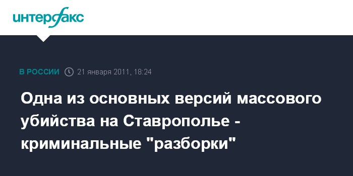 Москва/Пятигорск. 21 января. INTERFAX.RU - Оперативно-следственная группа отрабатывает в качестве основной версии массового убийства на Ставрополье раздел сфер влияния между криминальными группировками, сообщил "Интерфаксу" информированный источник в правоохранительных органах Северо-Кавказского федерального округа.