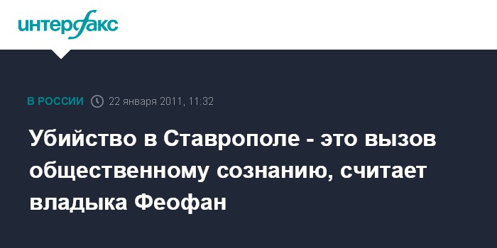 Ставрополь. 22 января. INTERFAX.RU - Архиепископ Ставропольский и Владикавказский Феофан считает, что массовое убийство в Ставрополе является вызовом всему общественному сознанию. "Когда так спокойно стали совершать массовые убийства у нас на юге, в Кущевке, Ставропольском крае, значит, у кого-то есть твердая уверенность в безнаказанности содеянного злодеяния", - заявил владыка Феофан в субботу агентству "Интерфакс-Юг".