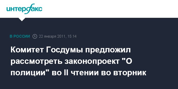 Москва. 22 января. INTERFAX.RU - Комитет Госдумы по безопасности предлагает провести второе чтение президентского законопроекта "О полиции" на заседании палаты во вторник, 25 января. Эта дата названа в официальном обращении комитета в Совет Думы, который в понедельник утвердит повестки ближайших заседаний палаты. Комитет по безопасности просит Совет назначить фиксированное время рассмотрения законопроекта во втором чтении - в 12.30 мск.