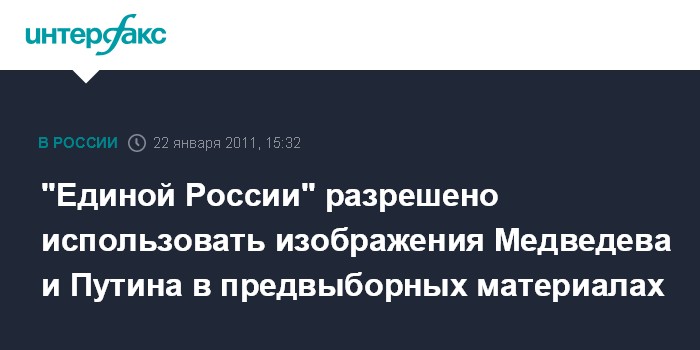Москва. 22 января. INTERFAX.RU - Дмитрий Медведев и Владимир Путин разрешили "Единой России" использовать их изображения и высказывания в предвыборных материалах, сообщила в субботу пресс-служба партии. Речь идет о предстоящих 13 марта этого года выборах в законодательные (представительные) органы власти субъектов РФ.