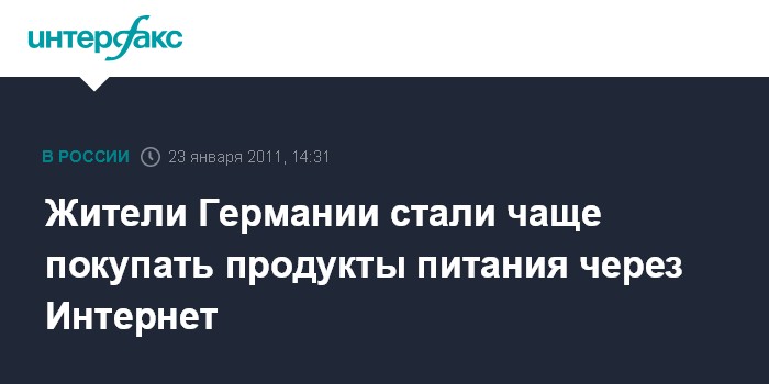 Берлин. 23 января. INTERFAX.RU - Число жителей Германии, приобретавших продукты питания через Интернет, в прошлом году значительно возросло, говорится в отчете Bitkom, подготовленном по результатам опроса. В 2010 году еду в виртуальных магазинах покупали 4,5 млн немцев, или 9% от общего числа пользователей Интернета в Германии - это в три раза больше, чем в 2009 году. Особой популярностью среди онлайн-покупателей пользуются деликатесы, которые не всегда можно приобрести в классических супермаркетах, а также свежезамороженные продукты и вина.