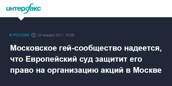 При этом собеседник агентства выразил надежду, что Европейский суд займет в споре позицию гей-сообщества и вынесет решение до запланированного на 28 мая в Москве шестого гей-парада. "Хочется надеяться, что Европейский Суд поставит в этом деле окончательную жирную точку до подачи нами уведомлений о проведении публичных акций шестого московского гей-прайда, запланированного на 28 мая этого года", - отметил он.