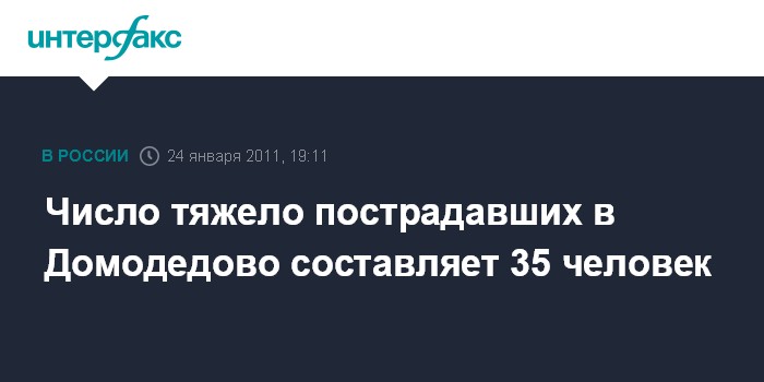 Москва. 24 января. INTERFAX.RU - 35 человек, пострадавших в результате взрыва в аэропорту "Домодедово", находятся в тяжелом состоянии, сообщила начальник Управления информации МЧС Ирина Андрианова.