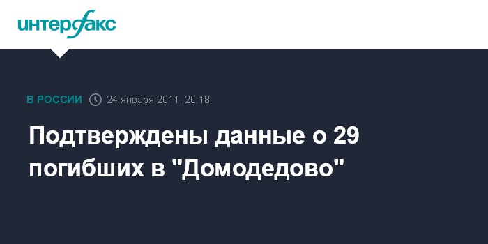 Ново-Огарево. 24 января. INTERFAX.RU - Количество погибших в результате теракта в аэропорту "Домодедово", данные о которых подтверждены, - 29 человек, сообщила глава Минздравсоцразвития Татьяна Голикова на встрече с премьер-министром РФ Владимиром Путиным.