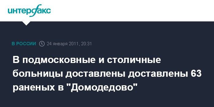 Москва. 24 января. INTERFAX.RU - По последним данным, в больницы госпитализированы 63 пострадавших во время взрыва в аэропорту "Домодедово", сообщает Минздравсоцразвития РФ.