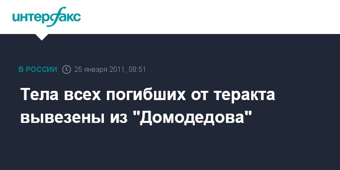 Москва. 25 января. INTERFAX.RU - Тела всех погибших в результате взрыва в столичном аэропорту "Домодедово" вывезены с места происшествия для проведения экспертиз и опознаний, сообщил "Интерфаксу" во вторник утром источник в правоохранительных органах.