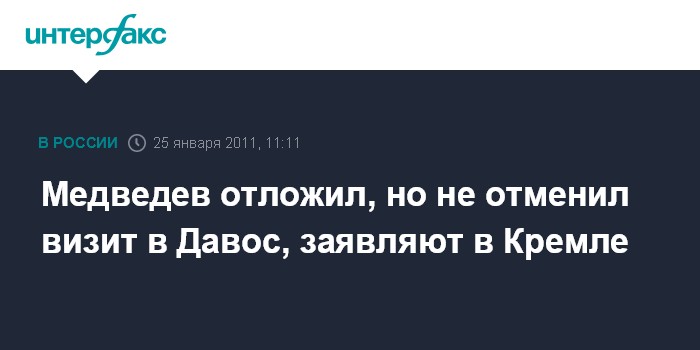 Москва. 25 января. INTERFAX.RU - Поездка президента РФ Дмитрия Медведева на Всемирный экономический форум в Давосе отложена, но не отменена, уточняют в Кремле.