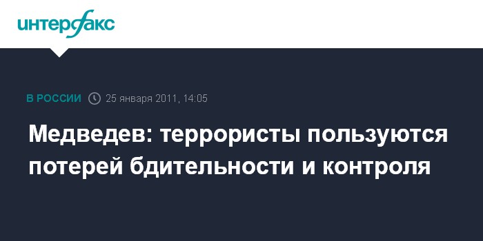 Москва. 25 января. INTERFAX.RU - Президент РФ Дмитрий Медведев после теракта в аэропорту "Домодедово" призвал правоохранительные органы и граждан РФ не ослаблять бдительность.