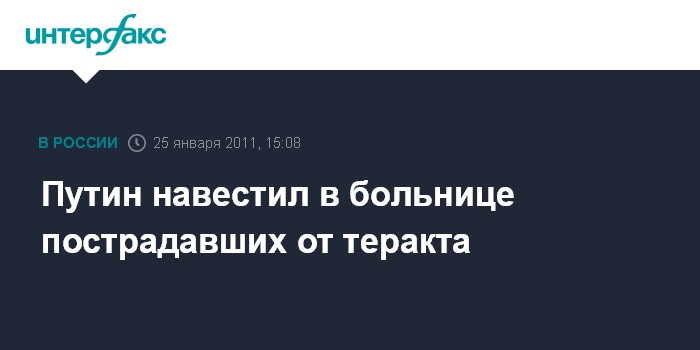 Москва. 25 января. INTERFAX.RU - Премьер-министр РФ Владимир Путин посетил пострадавших в результате теракта в аэропорту "Домодедово", которые были доставлены в Институт хирургии имени Вишневского.