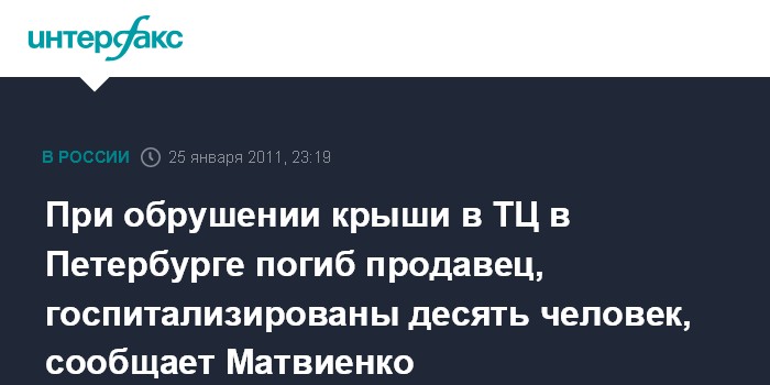 Санкт-Петербург. 25 января. ИНТЕРФАКС СЕВЕРО-ЗАПАД - Обрушение кровли в торговом центре в Петербурге произошло во время очистки от снега, погиб продавец, 10 человек травмированы, сообщила журналистам прибывшая на место происшествия губернатор города Валентина Матвиенко.