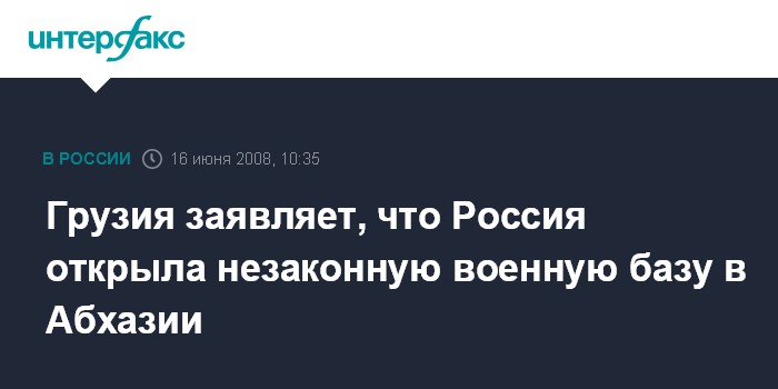 Москва. 16 июня. INTERFAX.RU - Грузинская сторона обвиняет Россию открытии в Абхазии еще одной военной базы без согласования с Тбилиси. База вступила в строй в районе села Агубедия Очамчирского района Абхазии, заявил грузинским журналистам представитель властей Автономной республики Абхазия Торнике Киланава.