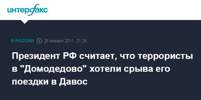 Давос. 26 января. INTERFAX.RU - Президент РФ Дмитрий Медведев считает, что те, кто, совершил теракт в аэропорту "Домодедово", рассчитывали, в том числе, сорвать его поездку на экономический форум в Давосе.