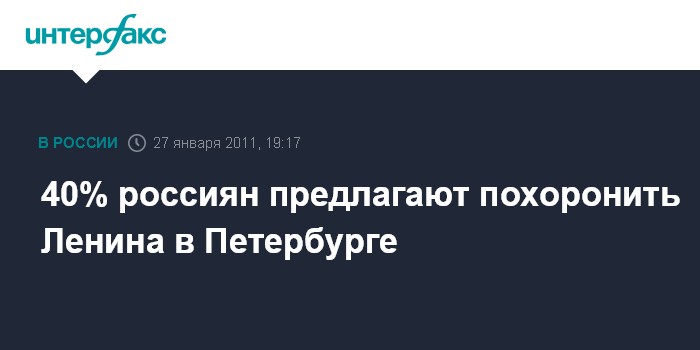 Москва. 27 января. INTERFAX.RU - Тело Владимира Ленина должно быть перезахоронено на Волковом кладбище в Санкт-Петербурге, где покоятся его мать и сестры, считает 40% россиян. Таковы данные опроса, проведенного 21-24 января социологами "Левада-Центра".