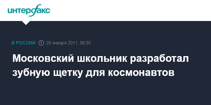 Москва. 27 января. INTERFAX.RU - Электрическую зубную щетку для космонавтов, не требующую использования воды, разработал совместно с Московским государственным медико- стоматологическим университетом ученик седьмого класса одной из московских школ, член общества молодых ученых этого же университета Дмитрий Резников.