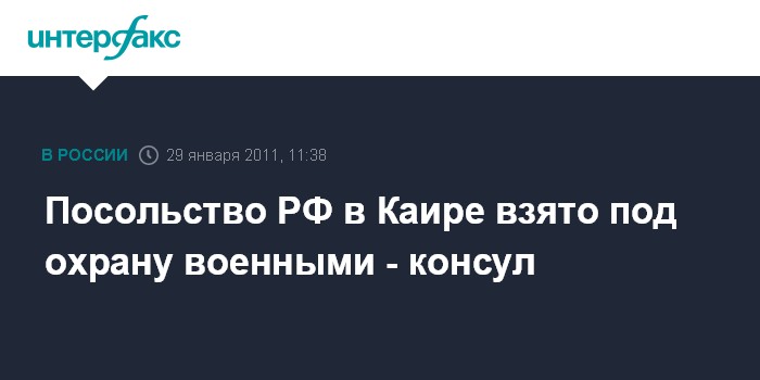Каир/Москва. 29 января. INTERFAX.RU - Египетские военные взяли под охрану здание посольства РФ в Египте, расположенное на улице Гизы в Каире. "Российское посольство охраняется солдатами. Вблизи диппредставительства стоит бронетехника и наряды военных", - сообщил заведующий консульским отделом посольства РФ в Египте Шамиль Утоев "Интерфаксу" в субботу.