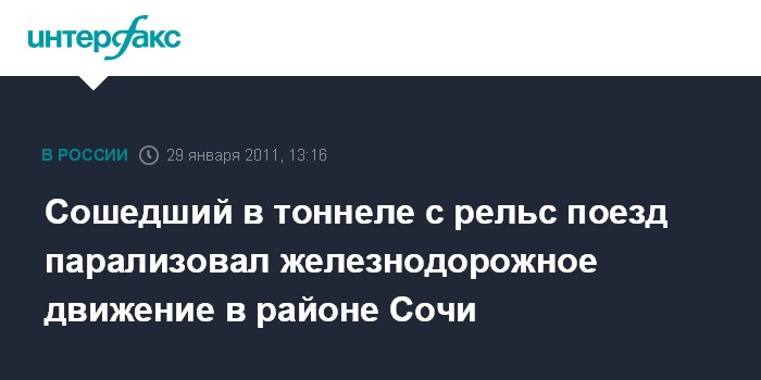 В транспортных структурах Южного федерального округа агентству "Интерфакс-Юг" уточнили, что авария произошла около 10:30 мск". По данным собеседника агентства, остановлено движение пассажирских поездов Адлер - Санкт-Петербург, Адлер - Киев и электропоезда Сочи - Туапсе. "В настоящее время к месту происшествия прибывают бригады путевых рабочих для осуществления постановки на рельсы сошедшего грузового вагона", - добавил он.
