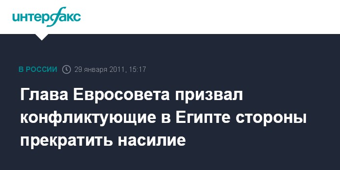 Брюссель. 29 января. INTERFAX.RU - О своем глубоком огорчении в связи с раскручивающейся спиралью насилия в Египте, которое только усложняет возможность диалога, заявил в субботу в Брюсселе председатель Европейского Совета Херман Ван Ромпей. "История показала, что диалог может привести к изменениям без применения силы и военного подавления, если для него создана благоприятная обстановка", - подчеркнул глава Евросовета.