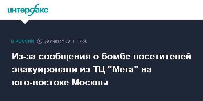 Москва. 29 января. INTERFAX.RU - Посетители торгового комплекса "Мега - Белая дача" эвакуированы из-за угрозы взрыва, сообщил "Интерфаксу" источник в правоохранительных органах. Он рассказал, что в милицию позвонил неизвестный и сообщил о якобы заложенном взрывном устройстве в торгово-развлекательном центре "Мега" на юго-востоке Москвы. "В настоящее время произведена полная эвакуация посетителей, сотрудники милиции проводят визуальный осмотр помещений, также здания "Меги" обследует кинолог с собакой", - сказал собеседник агентства.