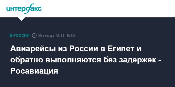 Москва. 29 января. INTERFAX.RU - Все рейсы из России в Египет и обратно выполняются без каких-либо задержек, отмен и сбоев, заявил в эфире радиостанции "Эхо Москвы" официальный представитель Росавиации Сергей Извольский. Он рассказал, что в субботу 11 российских городов успешно осуществили все рейсы в Египет. "В основном, это курортные зоны Шарм-эш-Шейх и Хургада. Пассажиры пока что не сдают билеты, и все рейсы как в Египет, так и из него выполняются без сбоев", - подчеркнул С.Извольский.