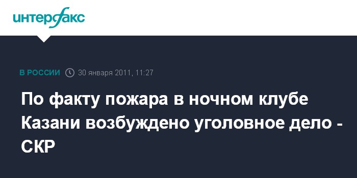 Москва. 30 января. INTERFAX.RU - Возбуждено уголовное дело по факту пожара в ночном клубе "Лепрекон" в Казани, в результате которого погибли четыре человека, сообщает СК РФ. Дело завели "по признакам преступления, предусмотренного ч. 3 ст. 238 УК РФ (оказание услуг, не отвечающих требованиям безопасности, жизни или здоровья, повлекшее по неосторожности смерть 2-х и более человек)", сообщает сайт СК РФ. "По предварительным данным, причиной пожара стала оставленная на диване непотушенная сигарета", - говорится в сообщении.