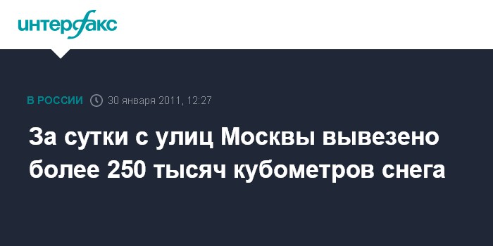 Москва. 30 января. INTERFAX.RU - С началом снегопада в ночь на воскресенье на улицы Москвы вышло необходимое количество снегоуборочной техники, сообщил "Интерфаксу" пресс-секретарь заместителя мэра по вопросам ЖКХ и благоустройства Игорь Пергаменщик. "Всего за сутки на снегосплавные пункты вывезено 252 тыс. кубометров снега", - сказал И.Пергаменщик.