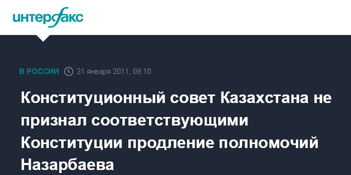 Астана. 31 января. INTERFAX.RU - Конституционный совет (КС) Казахстана признал несоответствующим Основному закону страны принятый парламентом закон "О внесении изменения и дополнения в Конституцию", предусматривающий возможность продления полномочий президента на референдуме и закрепление за первым президентом республики статуса "Ел басы" (Лидер нации).
