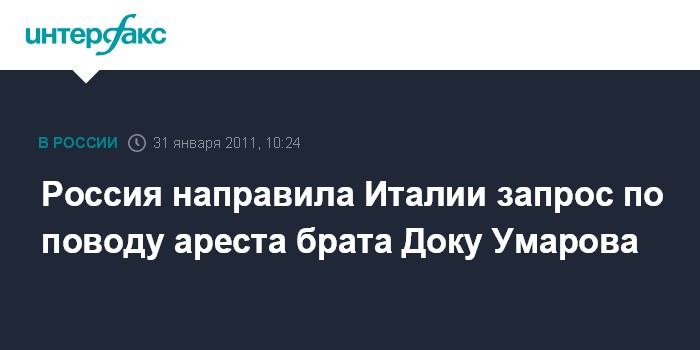 Москва. 31 января. INTERFAX.RU - Российская сторона запросила у Италии информацию об аресте 35-летнего Руслана Умарова, родного брата одного из лидеров северокавказского бандподполья Доку Умарова, сообщил "Интерфаксу" источник в правоохранительных органах в понедельник.