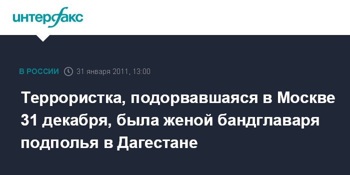 Махачкала. 31 января. INTERFAX.RU - Женщина, погибшая 31 декабря 2010 г. в Кузьминках от случайного взрыва взрывного устройства, была женой дагестанского бандглаваря Ибрагимхалила Давудова, сообщили "Интерфаксу" в пресс-службе УФСБ России по Дагестану.