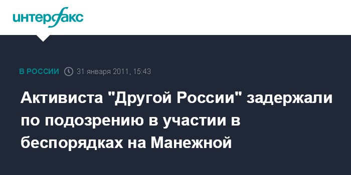 Москва. 31 января. INTERFAX.RU - Задержан активист "Другой России", подозреваемый в участии в массовых беспорядках на Манежной площади, сообщил официальный представитель СК РФ Владимир Маркин.