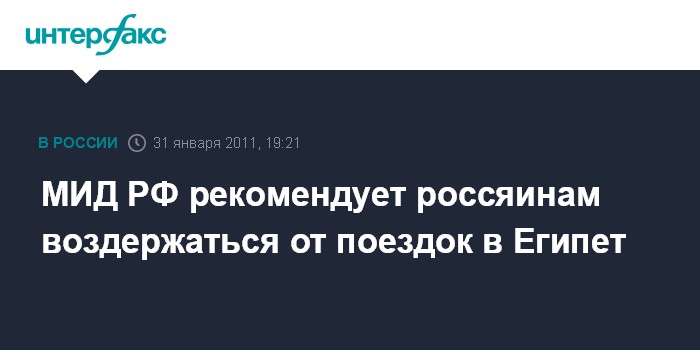 Москва. 31 января. INTERFAX.RU - Российский МИД призывает россиян воздержаться от поездок в Египет в связи с широкими протестными выступлениями в Каире и других городах этой страны.