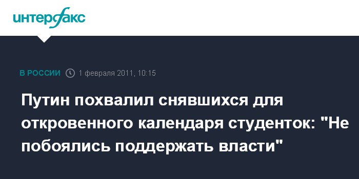 Москва. 1 февраля. INTERFAX.RU - Премьеру РФ Владимиру Путину понравился замысел календаря, который в прошлом году выпустили молодые девушки-журналистки, сфотографировавшиеся в достаточно откровенном виде.