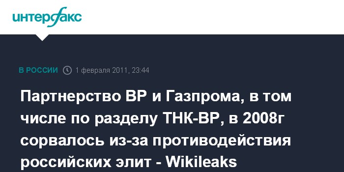 Партнерство BP и Газпрома, в том числе по разделу ТНК-ВР, в 2008г сорвалось из-за противодействия российских элит - Wikileaks