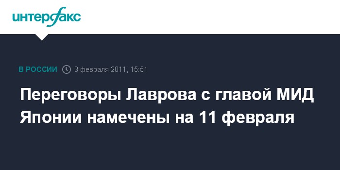 Москва. 3 февраля. INTERFAX.RU - Глава МИД России Сергей Лавров встретится со своим японским коллегой Сэйдзи Маэхарой в Москве 11 февраля.