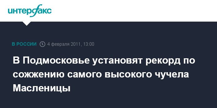 Москва. 3 февраля. INTERFAX.RU - В Истринской Долине 6 марта 2011 года во время празднования Масленицы планируется установить новый мировой рекорд и сожжено самое высокое чучело зимы в мире. В честь этого события с 13:00 до 17:00 в районе дер. Ушаково пройдут грандиозные масленичные гуляния.