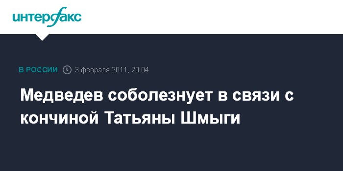 Москва. 3 февраля. INTERFAX.RU - Президент России Дмитрий Медведев выразил соболезнования близким, поклонникам артистки Татьяны Шмыги в связи с ее кончиной, сообщает пресс-служба главы государства в четверг.